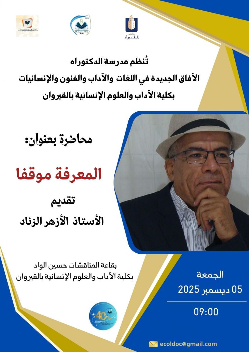 L'école doctorale « Nouvelles perspectives en langues, lettres, arts et sciences humaines » de la Faculté des lettres et sciences humaines de Kairouan organise une conférence intitulée :